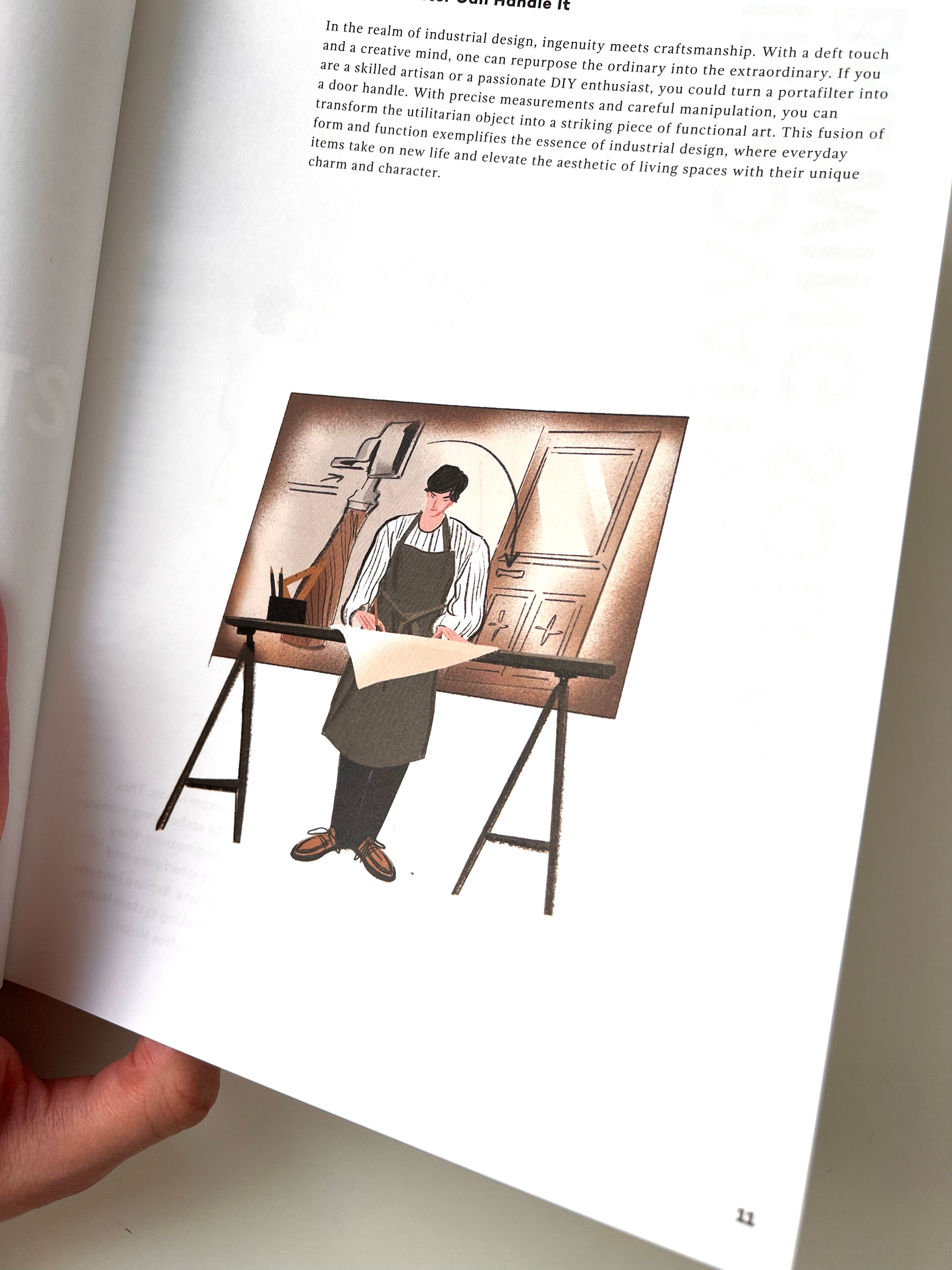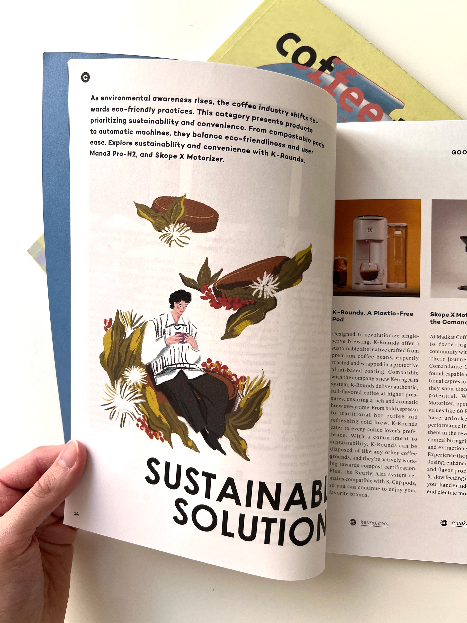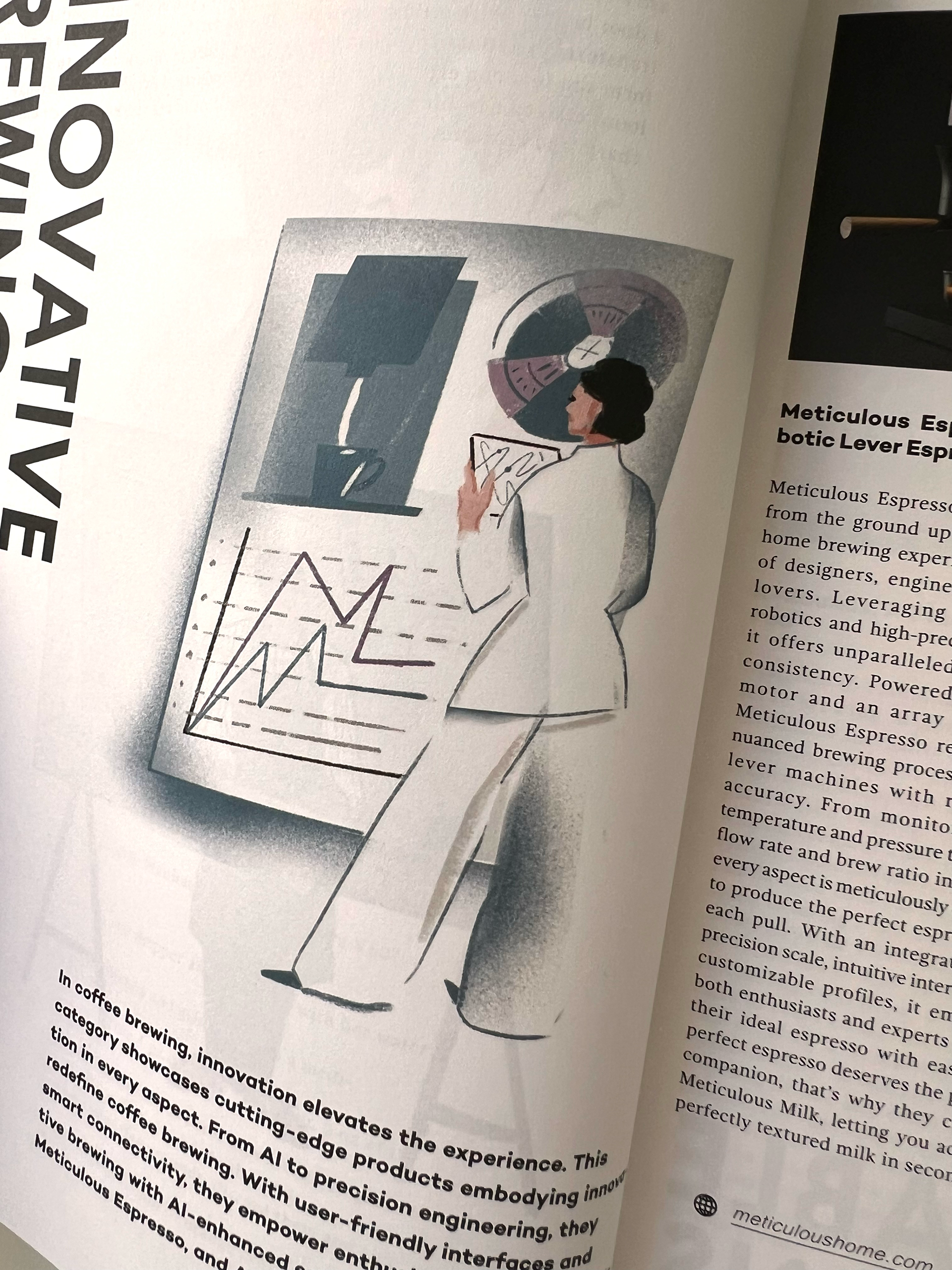 Coffee t&i is a coffee, tea and ice cream Chinese magazine. I illustrated article «Unlocking hidden talents». This is about unobvious options of using espresso machine and about recipe of сoffee Martini. The second article which I worked on advertised new products.