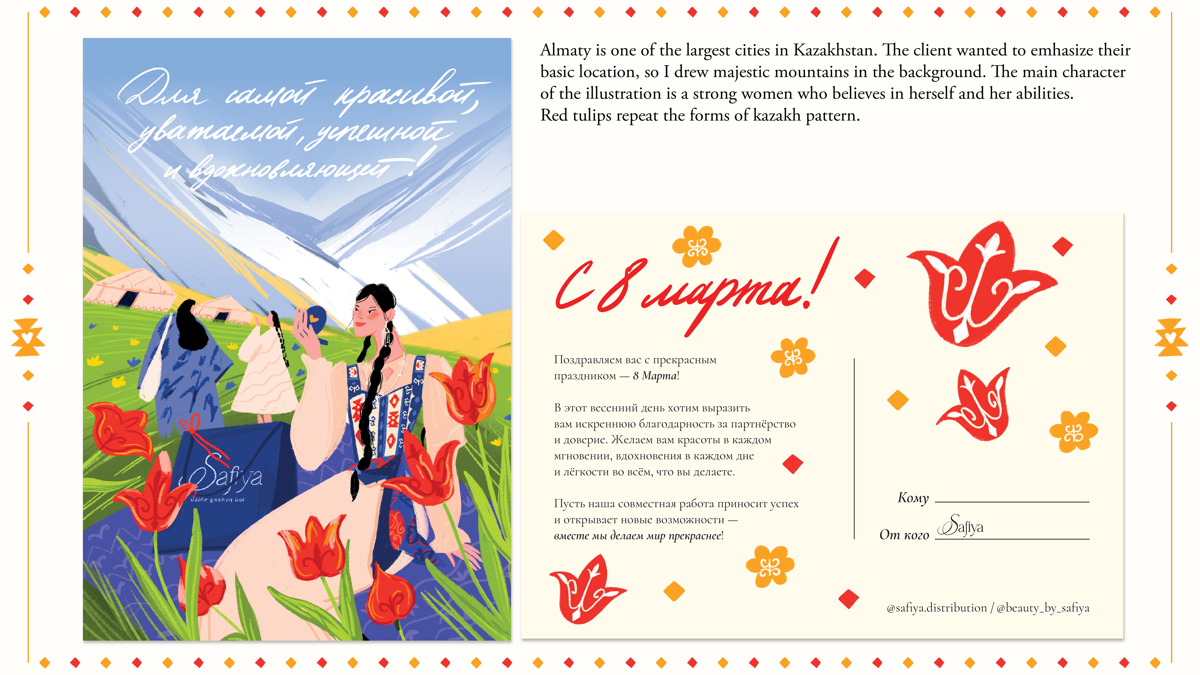 I'm happy to share my collaboration with the large cosmetic distributor «Safiya» in Kazakhstan. They wanted to create special gift merch for their clients in honor of International Women’s Day on March 8th. I developed the branding, including illustration and pattern for a postcard, stickers, a bottle, and a shopper bag. This was a significant project for me,as it gave me the opportunity to explore the rich culture and traditionsof Kazakhstan.
